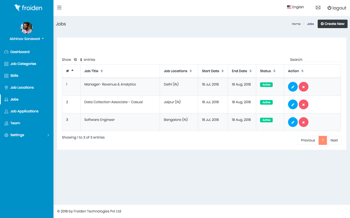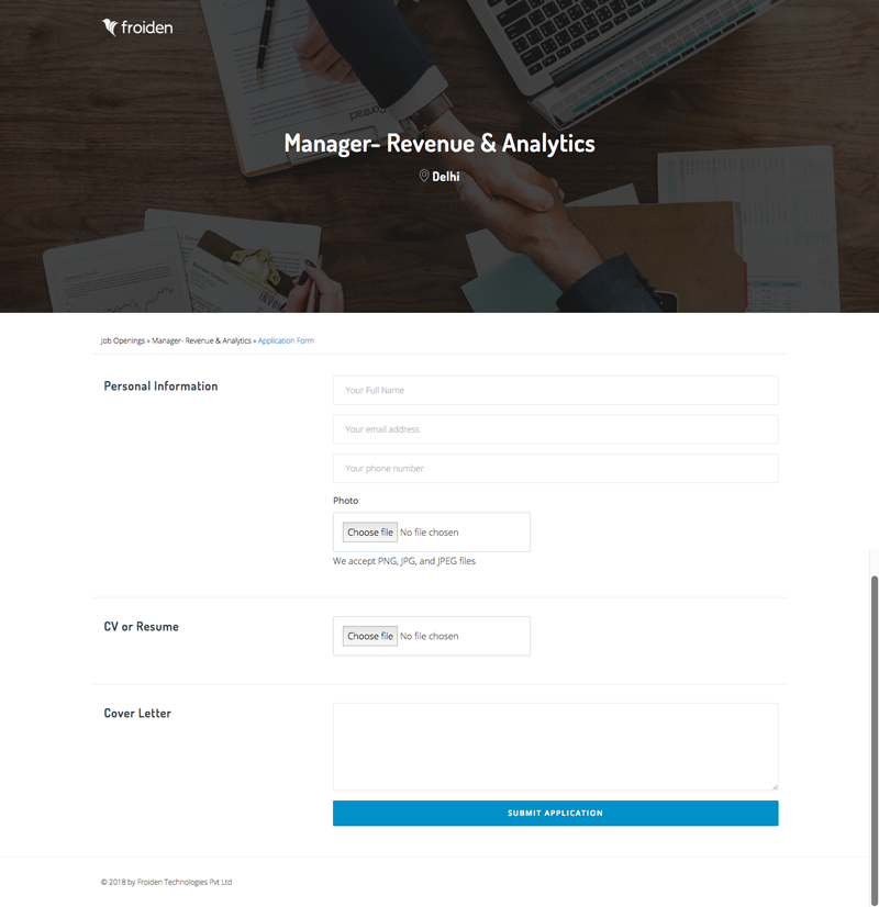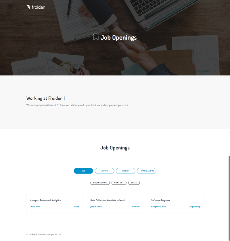 The main page displays the all the active job openings. Applicant can filter the openings on the basis of job category or location.