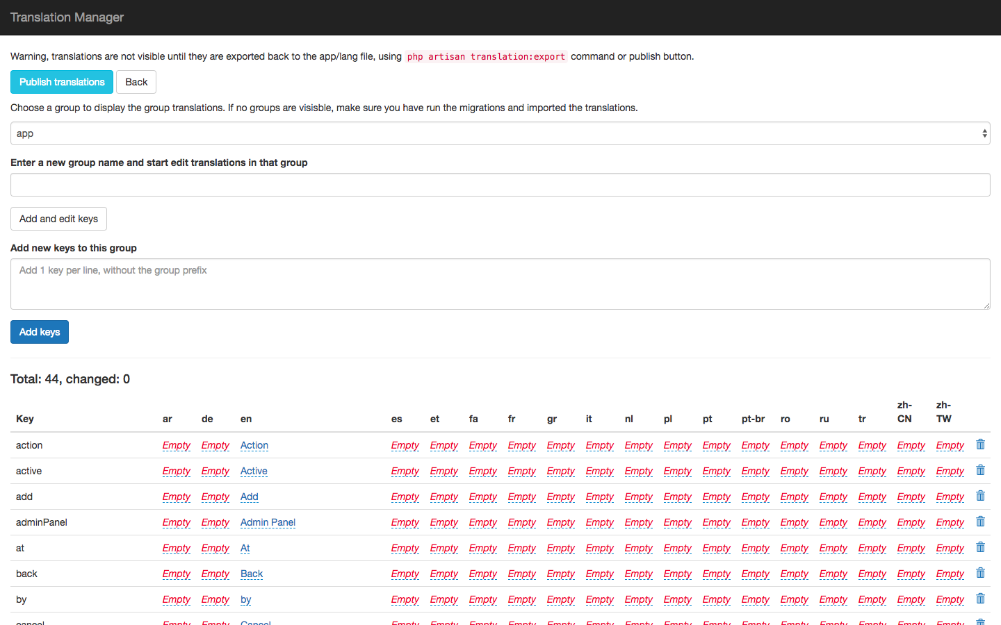 Your all translations are arranged in groups. Choose a group from dropdown to change the translations.