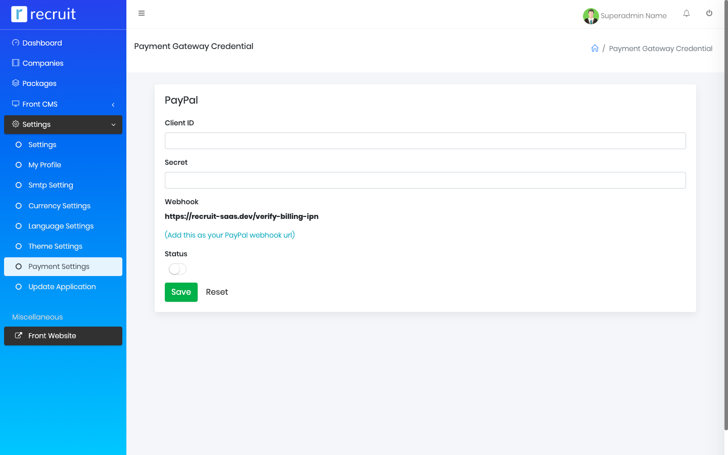 Add payment credentials for PayPal payment gateeway. Click this to know more https://froiden.freshdesk.com/support/solutions/articles/43000500792-paypal-integration